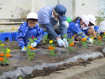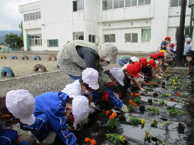 1、2年生の子ども達はベテランの方々に優しく教わりながら、丁寧にお花(サルビア、マリーゴールド)を植えていきました。校舎前の花壇がとっても素敵になりました。満開になるのが待ち遠しいです。長寿会の皆様、大変ありがとうございました。