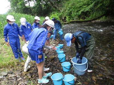 6月12日(月)、5年生の子ども達は学校からほど近いところを流れる馬淵川で、鮎の稚魚放流会に参加しました。現地では、南部馬淵川漁業協同組合の方々にご指導をいただきました。